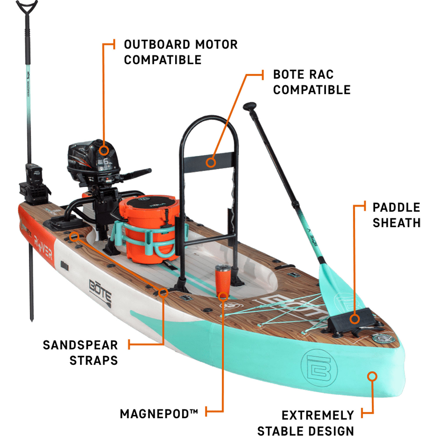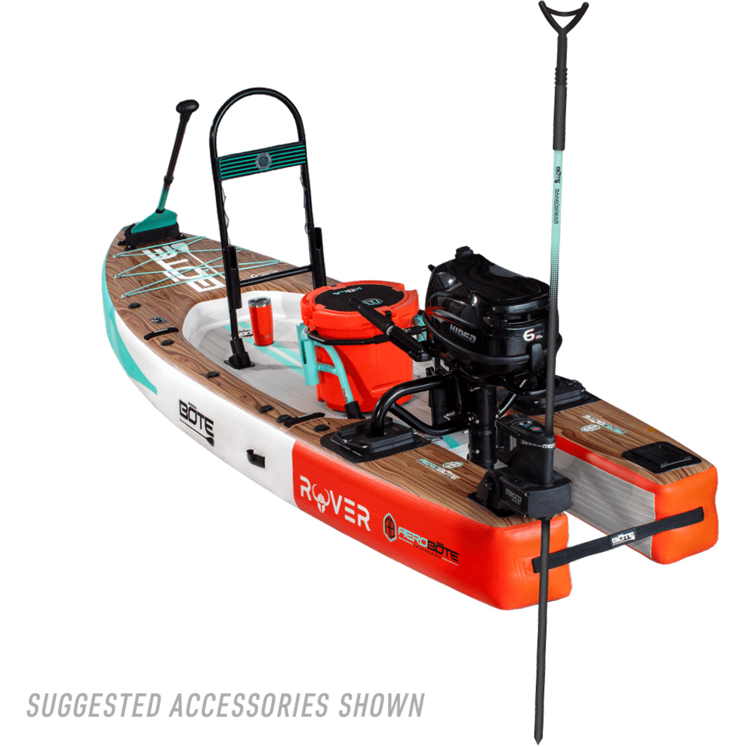 Der Rover Aero ist mit dem Power Rac kompatibel, einer batteriebetriebenen Kommandozentrale mit integrierten Lichtern, die elektronische Geräte wie Fischfinder und GPS-Geräte mit Strom versorgt.