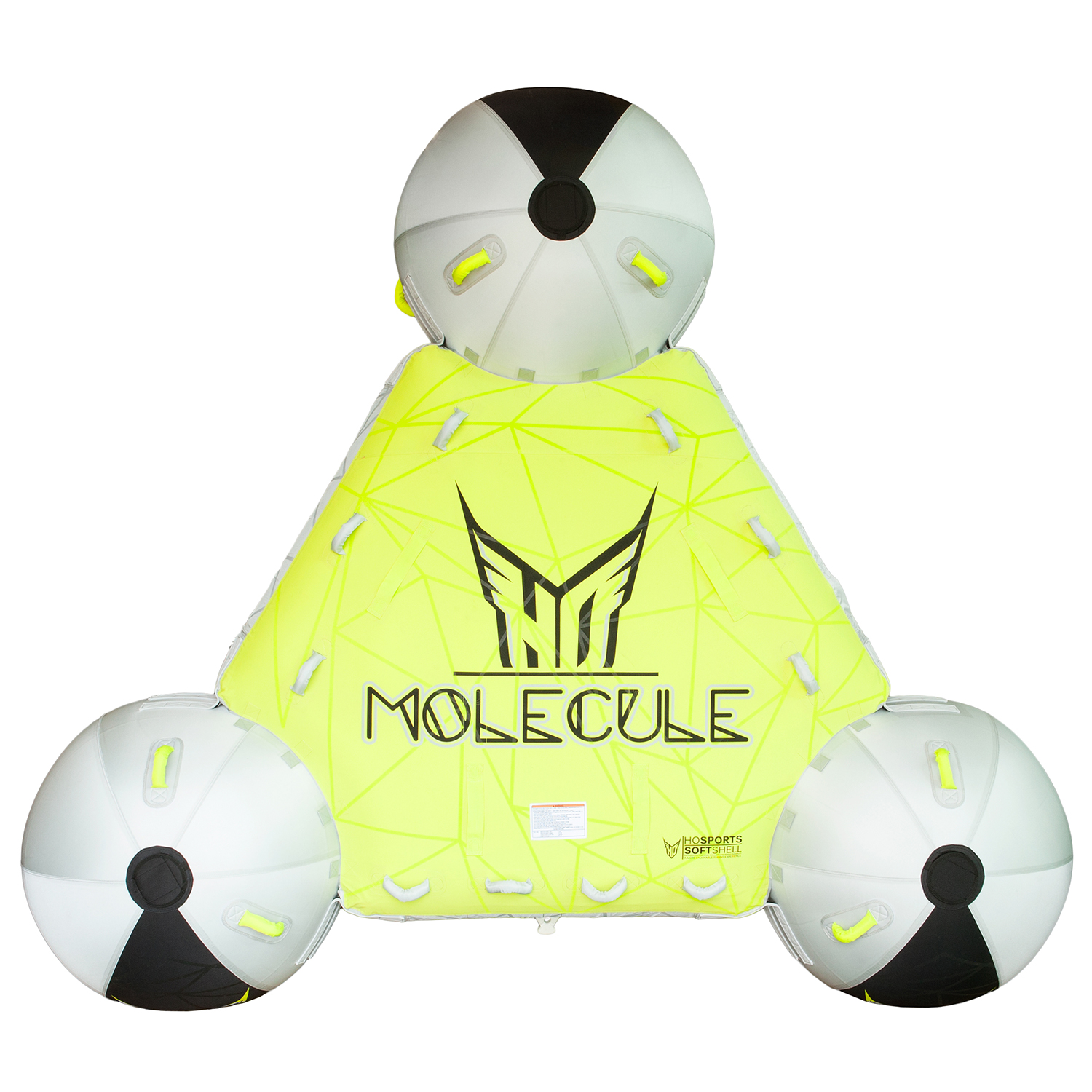 The Molecule uses the latest and most innovative technology in inflatables to perform like no other tube has ever dreamed! Its innovative, patented design isn't just for looks. Using 3 spheres, the center platform is suspended above the water with only the spheres contacting the surface. This dramatically lowers the surface contact and drag behind the boat. The result is an extremely quick sliding, large tube that works equally well on rough or smooth water. There are tons of handles, two towing orientations, and the riding positions are only limited by your own imagination.
