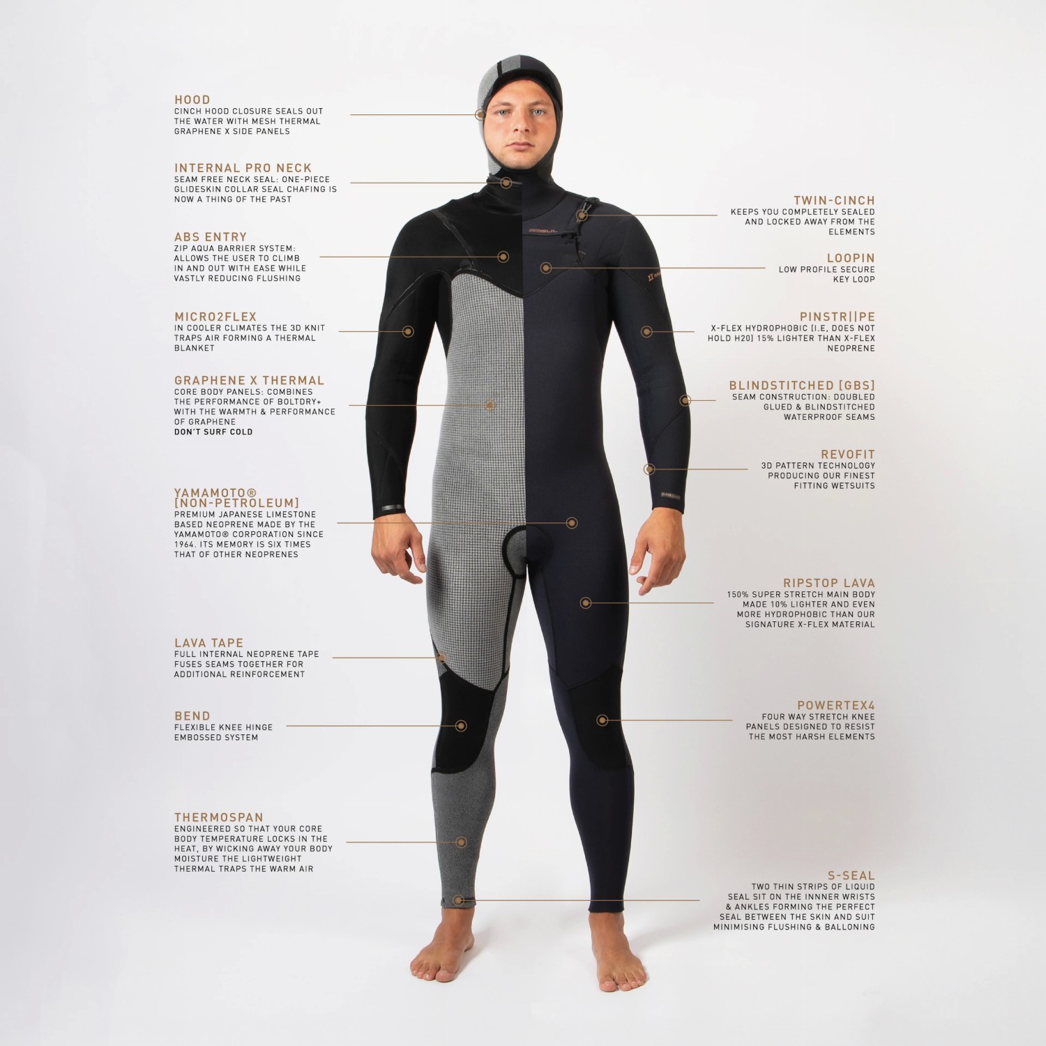 At the core of the Viper is Graphene X thermal technology, working alongside targeted wind-resistant and wicking panels to maintain warmth where it matters most. A fixed hood, sealed cuffs and ankles, and an advanced chest-entry system all work together to minimise water ingress, while high-stretch materials ensure the suit moves effortlessly with your body.