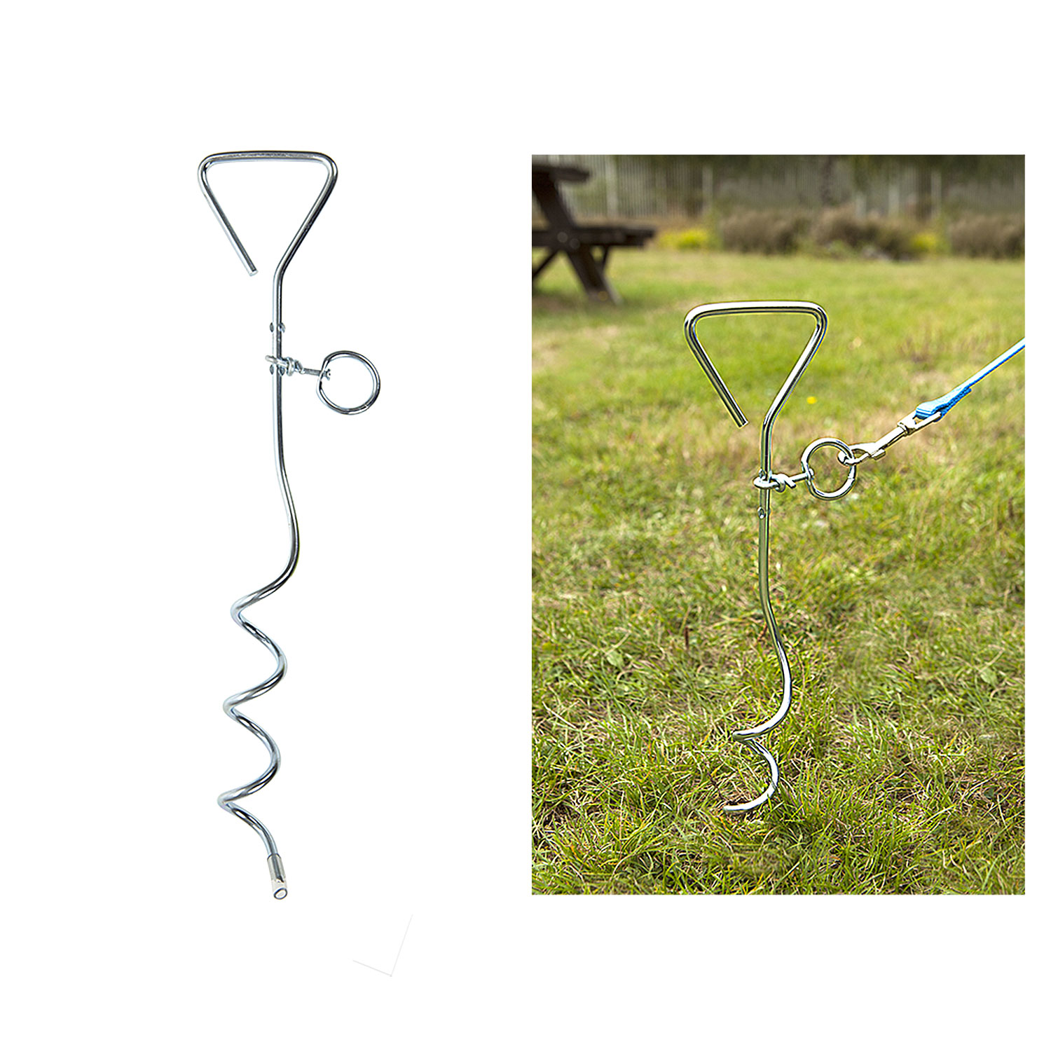 With its corkscrew design, this spiral anchor simply twists into the ground - ready for you to attach your pets lead to the ring provided. With its rotating abilities, your pet will be allowed to roam freely and safely while attached to the anchor. Ideal for when you are camping or on a picnic.